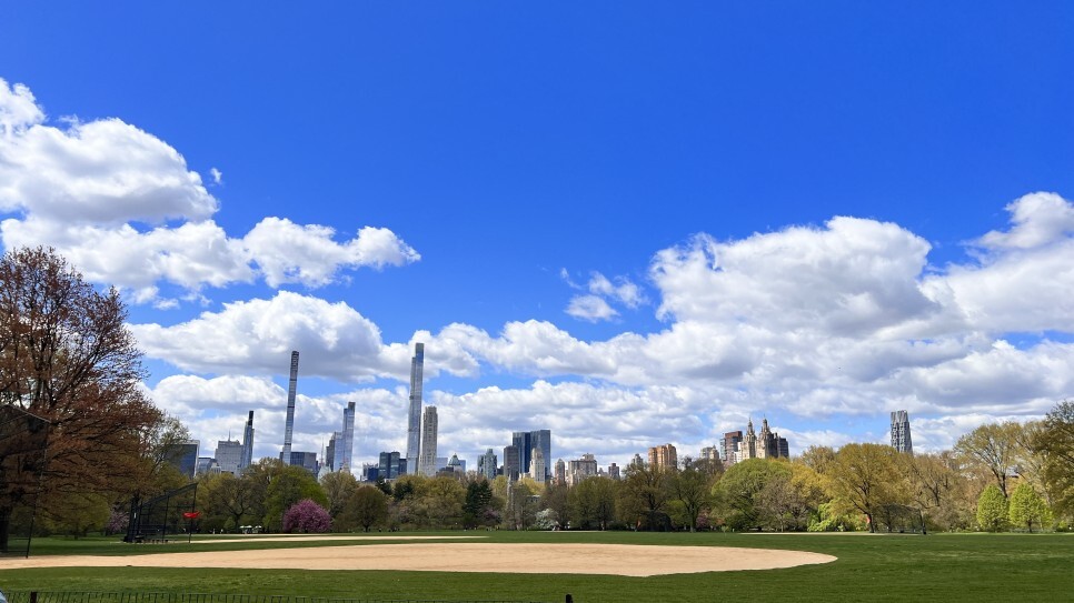 드 넓은 잔디밭, 높이 솟은 마천루, 하늘을 뒤 덮은 구름이 너무 멋졌다.